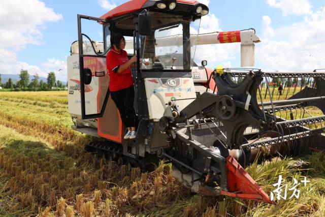 彼时的人群中,只见两米多高的收割机里,姑嫂俩手里晃动着操纵杆,脚踩离合,收放自如,收割机在她们的控制下前行、转弯、倒退,准确地将水稻收进去。