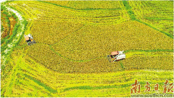 在连江口镇下步村,沉甸甸的稻穗压弯了稻秆,200多亩连片水稻宛如巨大的金丝带坠落于翠绿的山谷间。7月25日上午,随着收割机的轰鸣声响起,两台联合收割机进入稻田开始收割水稻,不一会就收获满仓,随即金灿灿的稻谷就被转卸到货车中,并送往加工厂。