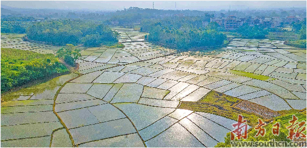 7月末,走进高州市沙田镇乐山村,只见灌满水的农田里,一株株翠绿的秧苗笔直有序地排列着。“今年,我们为了抢抓农时,一边收割、一边开始土地盘整,为晚造生产提前做好准备。”乐山村党总支书记曾豪说。