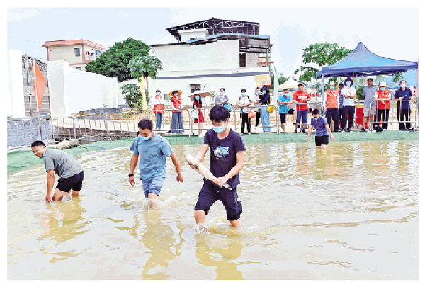 在活动区域,打糍粑、磨豆腐、烤米饼等“丰收进农家”特色展示活动体验感强,套圈、抓鱼、吃西瓜、剥花生等充满农趣的活动也深受村民和游客喜爱。