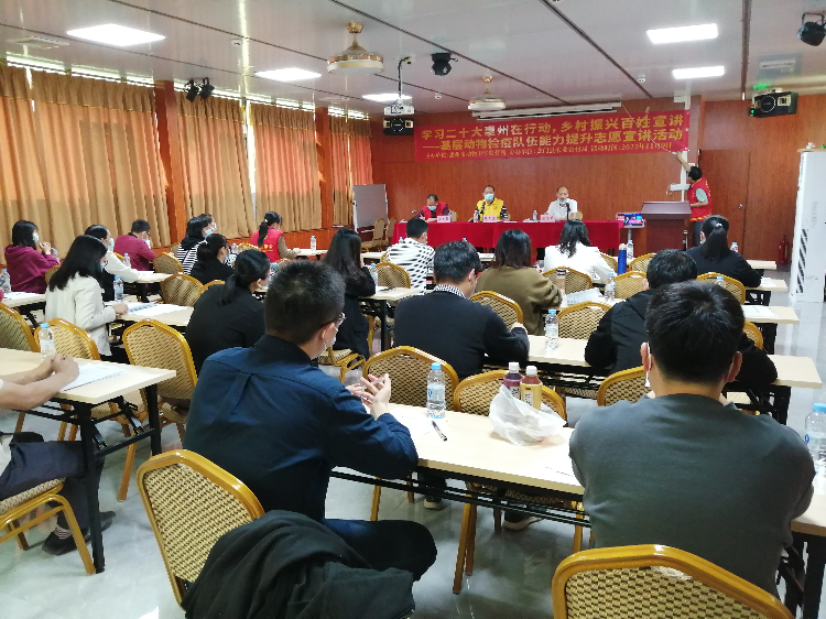 为深入学习宣传贯彻党的二十大精神,切实把思想和行动统一到党的二十大精神上来,把力量凝聚到党的二十大确定的各项任务上来。11月9日上午,按照市农业农村局的部署,惠州市动物卫生监督所协同龙门县农业农村局举办以“学习党的二十大惠州在行动 乡村振兴百姓宣讲”为主题的基层动物检疫队伍能力提升志愿宣讲活动。市农业农村局乡村振兴宣讲队成员邓惠棠任活动主讲,龙门县农业农村局副局长谢学平、龙门县动物卫生监督所所长黄志强出席活动,龙门县畜牧兽医一线工作人员共32人参加活动。