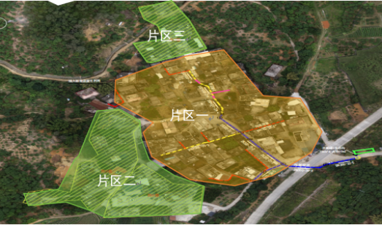高州市根子镇榕树角村资源化利用片区划分图:片区一经预处理后用于农业灌溉;片区二、三利用房前屋后进行消纳。