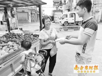 江门市新会区大鳌镇村干部向群众派发宣传资料。