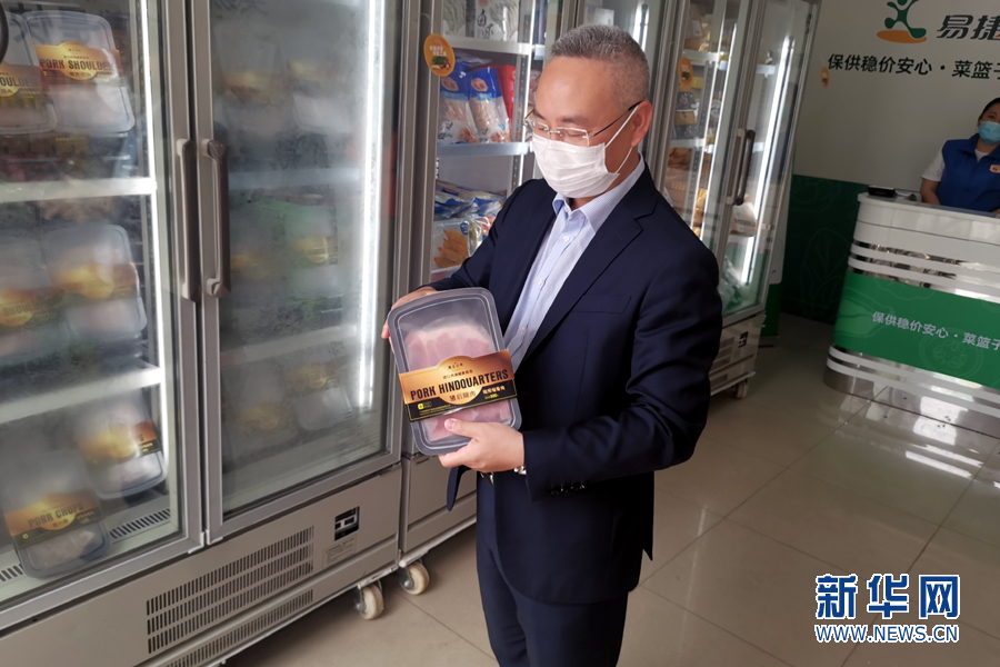 广东丰瑞佰顺集团有限公司董事长张敬智介绍店内的猪肉产品。新华网 记者 卢鉴 摄