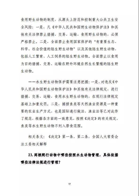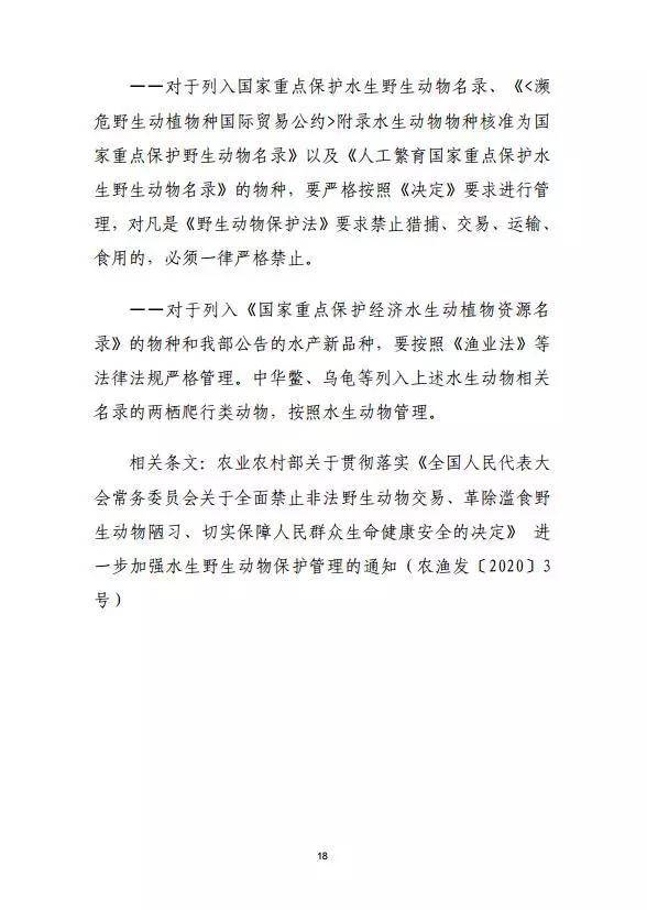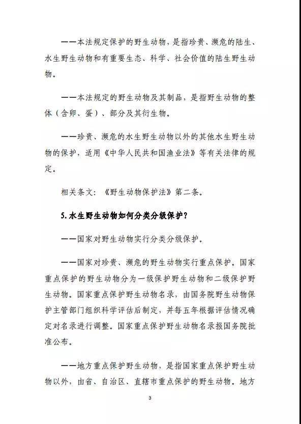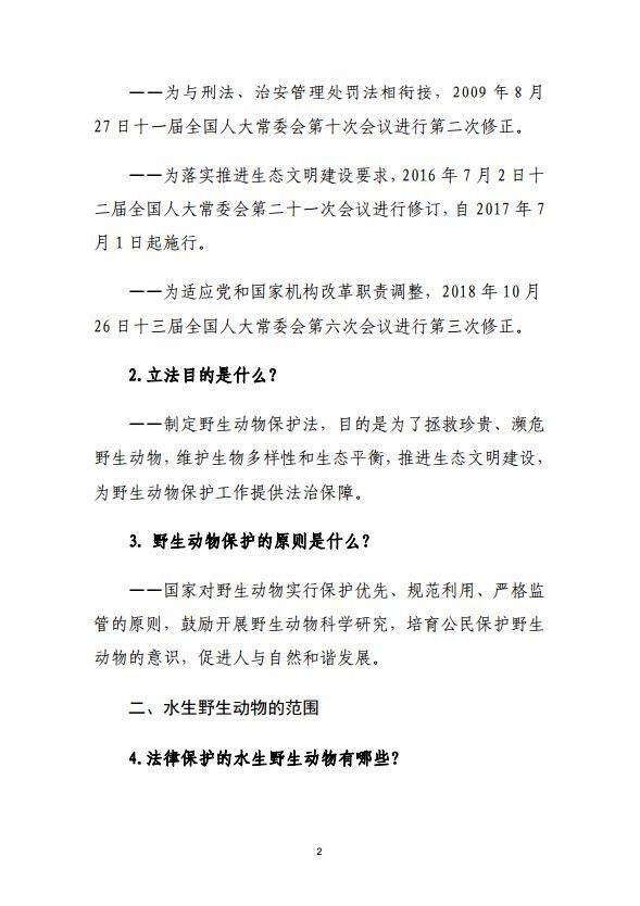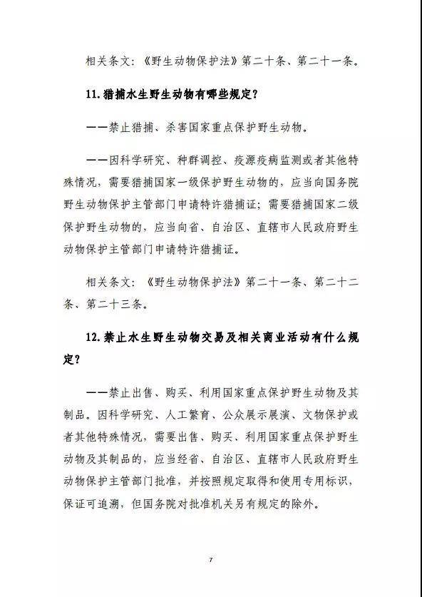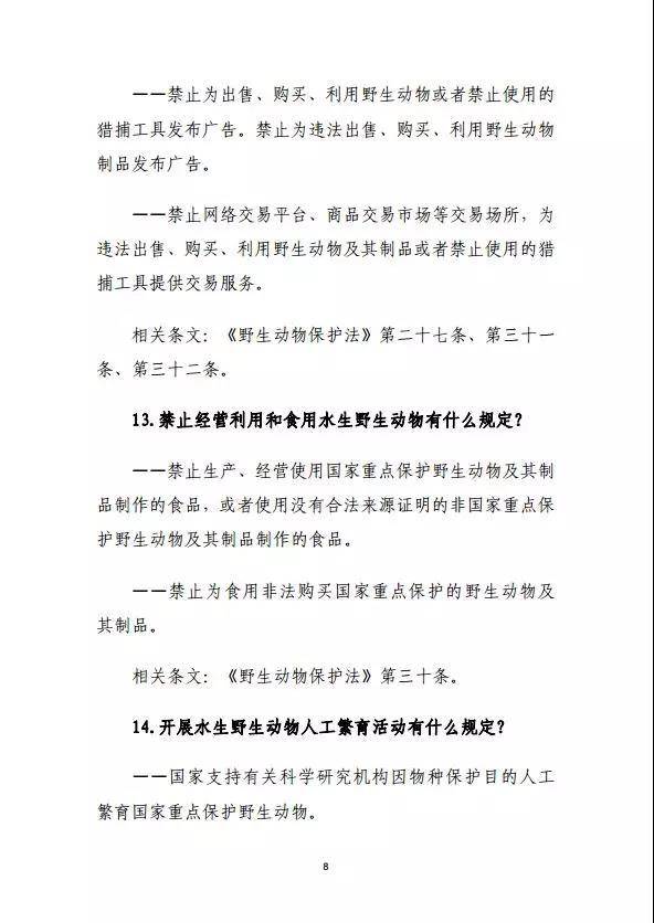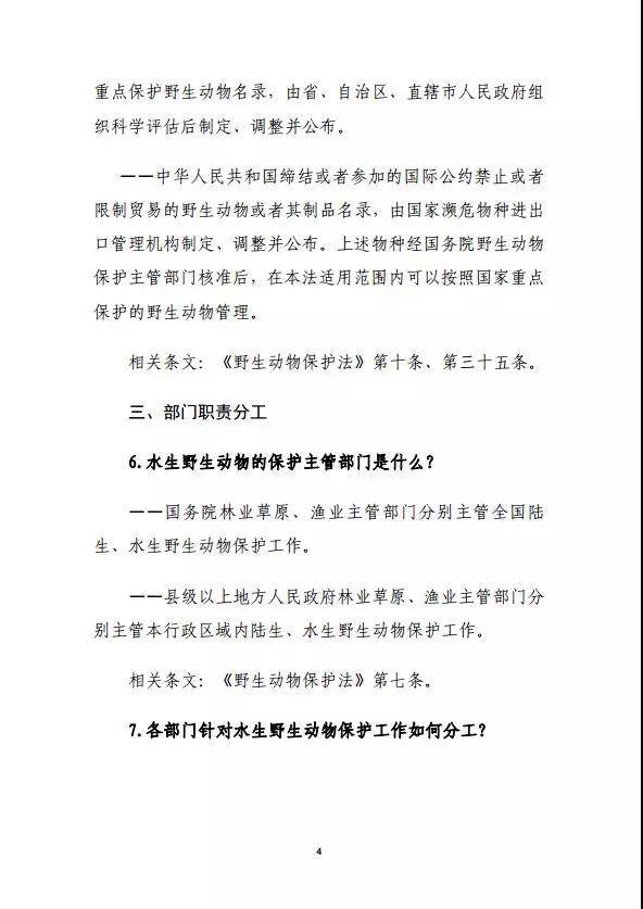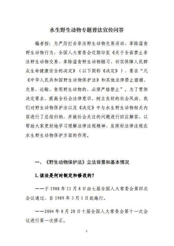 为贯彻落实全国人大常委会《关于全面禁止非法野生动物交易、革除滥食野生动物陋习、切实保障人民群众生命健康安全的决定》要求,提高全社会法律意识,树立良好的社会风尚,日前,农业农村部组织有关专家,对野生动物保护法以及《决定》中与水生野生动物相关内容进行了总结归纳,并就社会关注的问题进行回应解答,形成水生野生动物专题普法宣传问答。