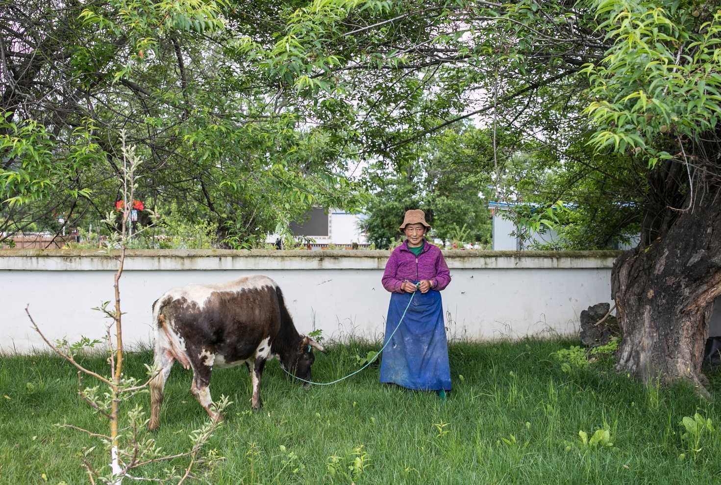 一位藏族妇女牵着牛回到自家的院子里。广东援藏工作队开展“结对结亲、交流交融”活动,促进民族团结、增进粤藏情谊。南方日报记者 张由琼 摄