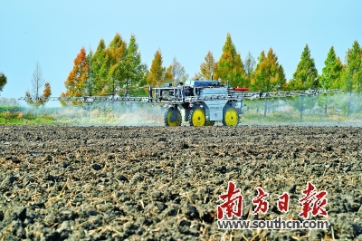 植保打药机在田间演示高精度的无人驾驶自动喷药。