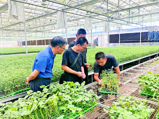 广东省农业技术推广总站站长林绿(左一)在樱桃番茄育苗场进行指导。