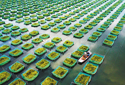图为广州市白云区峡石村一个黄鳝网箱养殖场,渔农撑着小船为鳝鱼投喂食物。