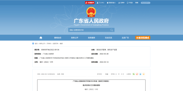 3月14日,《2022年省〈政府工作报告〉重点任务分工方案》(简称《分工方案》)印发。《分工方案》将2022年广东省《政府工作报告》确定的主要预期目标和十大重点工作任务,对应分解为出台政策、制定工作方案、组织重大活动、召开推进会议等具体举措,并逐项明确分管省领导和部门分工。
