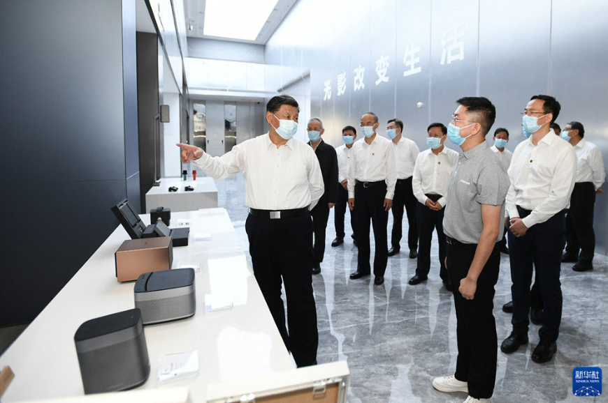 随后,习近平考察了极米光电有限公司。他走进公司展厅和生产车间,了解企业加强自主创新、产品研发销售、带动就业和当地支持民营经济发展、出台纾困帮扶政策等情况。习近平强调,推进科技创新,要在各领域积极培育高精尖特企业,打造更多“隐形冠军”,形成科技创新体集群。