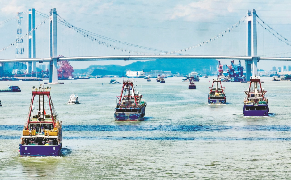 16日上午9时,参与联合巡航的船艇组成编队,沿湛江港主航道巡查水域秩序,为开渔前做好准备,保障辖区通航水域畅通。