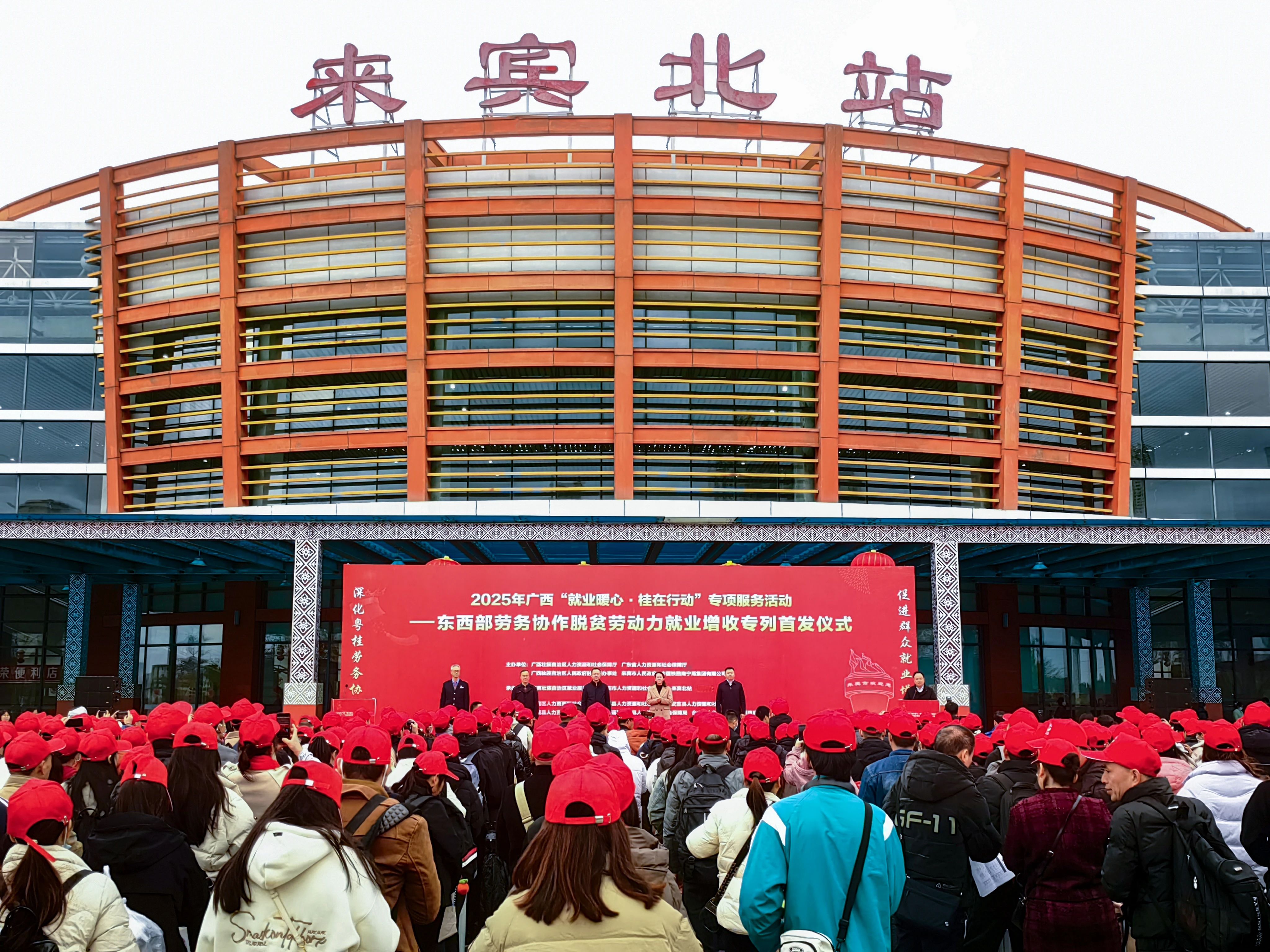 2025年2月3日正月初六,广西东西部劳务协作脱贫劳动力就业增收专列首发仪式在来宾北站举行,本次活动由广西壮族自治区人力资源和社会保障厅、广东省人力资源和社会保障厅、广西壮族自治区人民政府驻广州办事处、来宾市人民政府、中国铁路南宁局集团有限公司主办,广西壮族自治区人力资源和社会保障厅党组成员、副厅长韦杰,来宾市人民政府副市长杨远艳等出席活动。