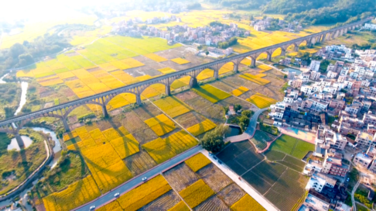 2025年金秋时节,梅州平远县泗水镇梅畲村龙颈梯田迎来了晚稻的丰收季节,千亩梯田悉数披上了“金甲”,成为秋日里最为动人的风景。从高空俯瞰,梯田依山势而建,层层叠叠,自千米海拔处蜿蜒而下,宛如一条金色游龙盘踞于山间;沉甸甸的稻穗将稻秆压弯,微风吹拂下掀起阵阵金色浪涛,与村中保存完好的古朴客家民居相映成趣,勾勒出一幅诗意盎然的晚稻丰收画卷。