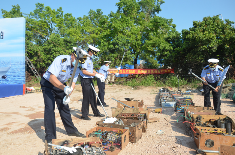 2022年4月28日下午,广州市南沙区集中销毁涉渔“三无”船舶现场会在南沙区万顷沙镇举行,共销毁涉渔“三无”船舶82艘及升压器(电鱼机)、发电球、电鱼网等违法电鱼工具一批。广州市农业农村局二级巡视员蔡伟科同志出席活动并致辞,南沙区副区长刘小潼同志作工作报告。市区海洋综合执法、南沙区综合行政执法、海警、海事等部门有关负责同志以及南沙区各镇街和渔民代表共40余人共同参与见证。