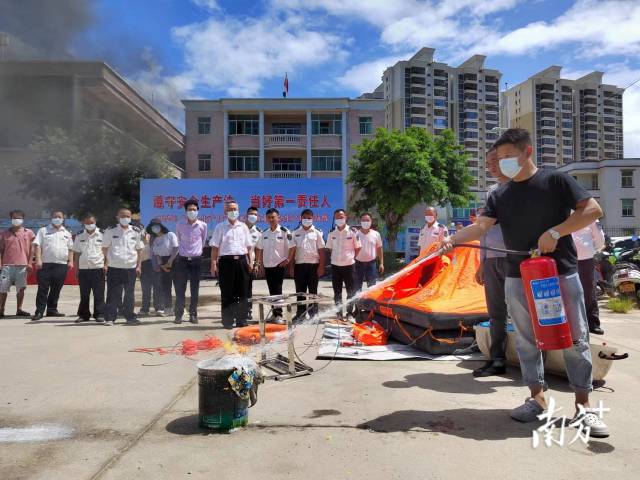 “当船舶遇险,人员需要撤离逃生时方可使用气胀救生筏。”“拔出与存放筒绑索相连的手动脱钩上的插销,向上推出滑环,使手动脱钩与绑索松脱。”“当船员全部进入救生筏后,应手持并拉发引燃式红光火焰型烟火信号,发出求援信号。”……这是6月28日上午,在惠来县神泉渔港举办的2022年“安全生产月”渔业安全生产应急演练活动。活动现场,惠来县海安救生设备检测站技术人员为渔民现场演示救生筏、烟雾式求救信号和发光式求救信号等安全操作。