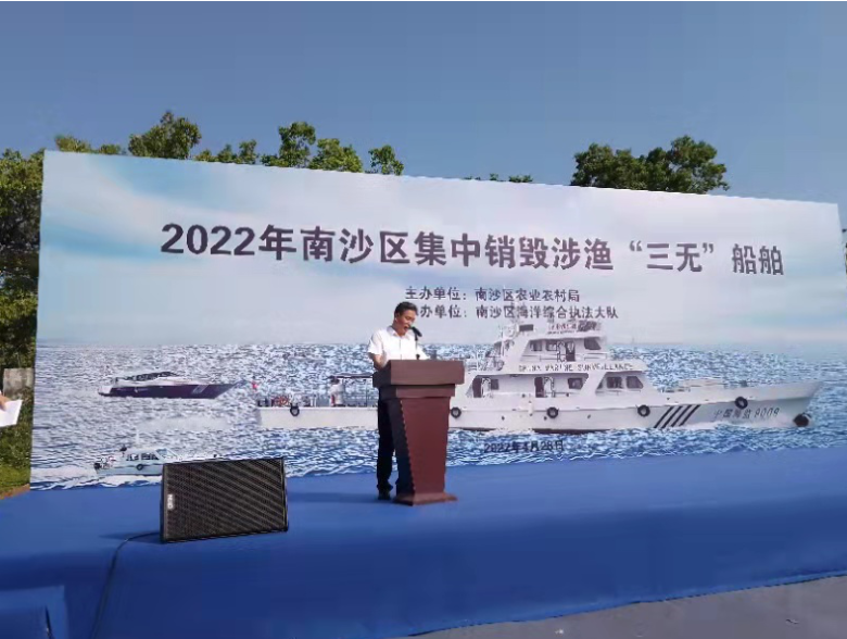 2022年4月28日下午,广州市南沙区集中销毁涉渔“三无”船舶现场会在南沙区万顷沙镇举行,共销毁涉渔“三无”船舶82艘及升压器(电鱼机)、发电球、电鱼网等违法电鱼工具一批。