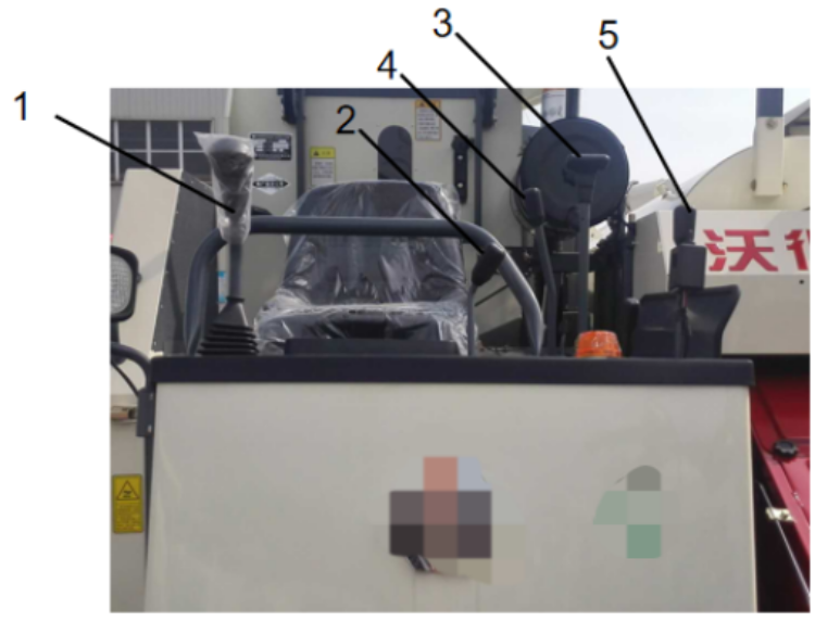 1主操纵杆、2拨禾轮控制手柄、3主变速手柄、4副变速手柄、5卸粮搅龙旋转操作手柄。