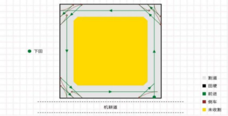 (一)四边收割法。对于长和宽相近、面积较大的田块,开出割道后,收割一个割幅到割区头,升起割台,沿割道前进5 m~8 m后,边倒车边向右转弯,使机器横过90°,当割台刚好对正割区后,停车,挂上前进挡,放下割台,再继续收割,直到将谷物收完。