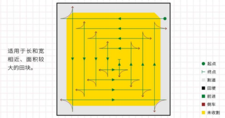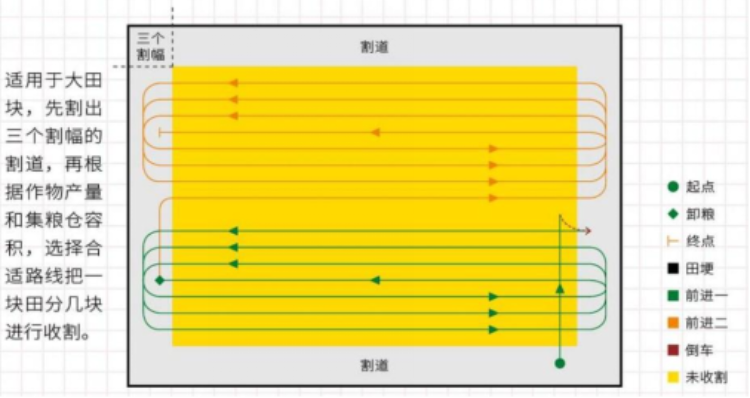(三)分块收割法。对于大田块,先割出三个割幅的割道,再根据作物产量和积粮仓容积,选择合适路线把一块田分几块进行收割。