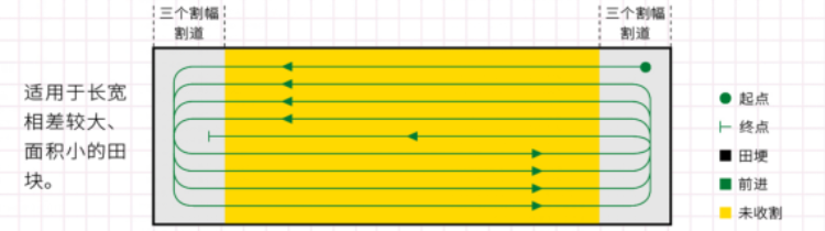 (二)梭形双向收割法。对于长宽相差较大、面积较小的田块,沿田块两头开出三个割幅的割道,沿长方向割到割区头,不用倒车,继续前进,左转弯绕到割区另一边进行收割。