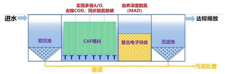 本模式核心技术体系为高效固定生物床(CAF)+硫自养反硝化深度脱氮滤池(MAD)的组合技术,通过多级A/O工艺去除COD和实现同步脱氮除磷。