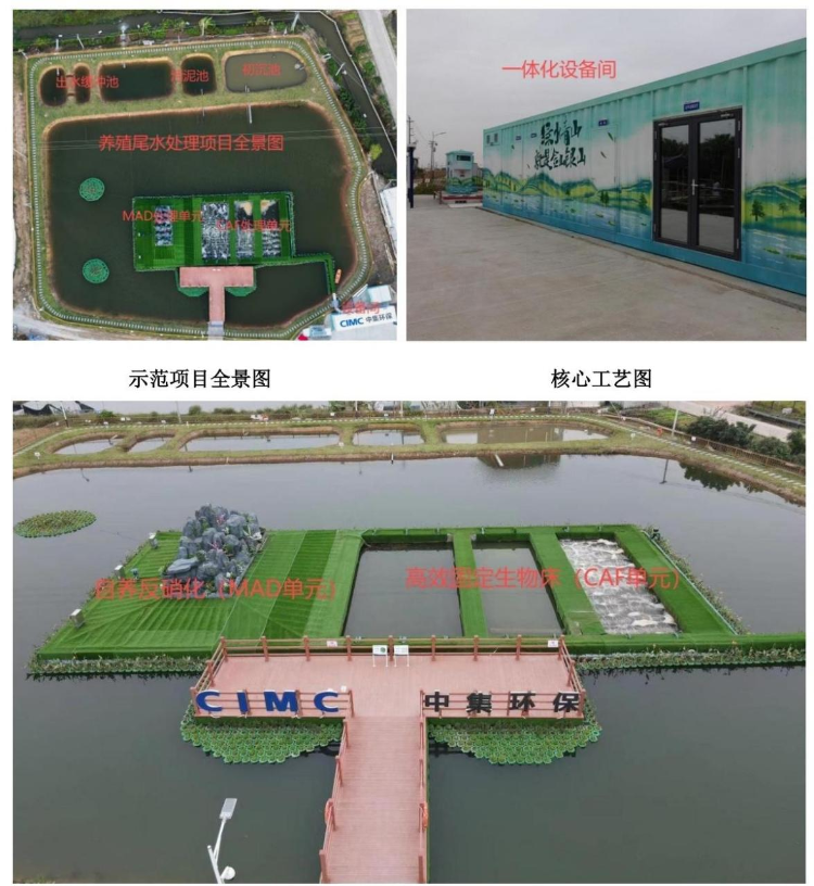 位于新会区大鳌镇。“一池一岛”处理技术,即高效固定生物床(CAF)与硫自养反硝化深度脱氮滤池(MAD)组合技术。其中固定生物床(CAF)的新型生物填料填充密度高、比表面积大等优势,可高效去除水中COD、总氮、总磷且污泥产量低;自养反硝化深度脱氮(MAD)采用硫自养深度脱氮技术稳定高效脱氮。处理后出水能稳定达标广东省《水产养殖尾水排放标准》(D44/2462 - 2024)淡水养殖一级标准。主要流程为:进水→沉淀池→CAF单元→MAD单元→沉淀池→排放