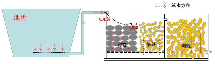 细沙过滤池:细沙池下方设置孔状挡板,孔直径小于细沙直径,挡板距离底层20cm。细沙池底层与碎石池连通,对过滤水中悬浮物质和颗粒物进一步过滤和吸附。