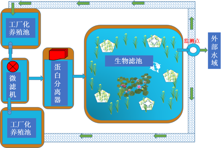 微生物处理池:将鱼体代谢产生的NH3通过微生物的硝化作用转变为NO3-或通过微生物的反硝化作用将NO3-转变为N2。