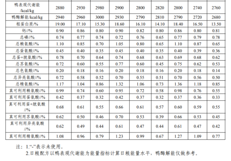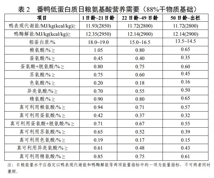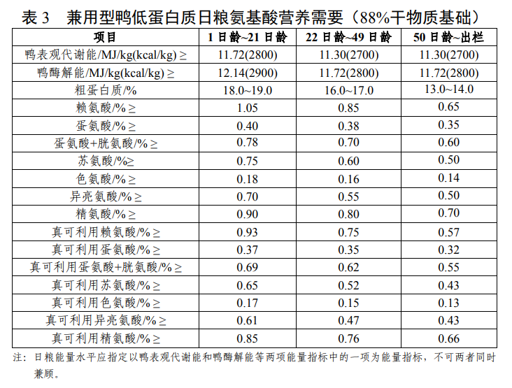 此外,肉鸭对矿物元素和维生素需要量可参考现行农业行业标准《肉鸭饲养标准》(NY/T 2122-2012)或中国畜牧业协会团体标准《鸭饲养标准》(T/CAAA 053-2020)以及后续即将发布的相关标准。