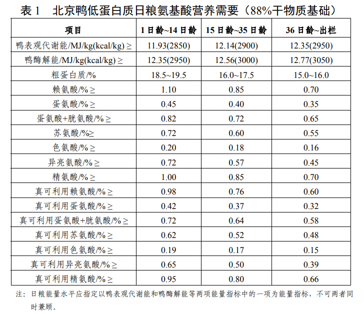 肉鸭低蛋白质日粮配制不仅应满足肉鸭生长发育对各种必需氨基酸需要,还应满足肉鸭生长发育对能量、维生素、矿物元素等其他营养素的需要。