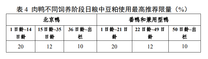 不同类型肉鸭不同饲养阶段日粮中豆粕使用最高推荐限量见表4。半番鸭不同饲养阶段日粮中豆粕使用最高推荐限量可参照番鸭的推荐量。