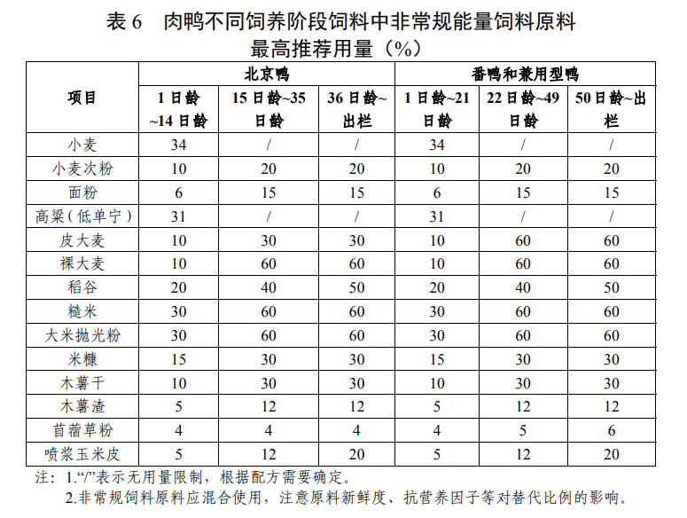 能量饲料原料是肉鸭日粮中能量的主要来源。肉鸭常用的非常规能量饲料原料主要来源于谷实类饲料和动植物油脂,主要包括小麦、大麦、高粱、稻谷、豆油、动物油脂等。在肉鸭日粮中,非常规能量饲料原料可以适当替代玉米的用量,但需结合油脂的添加,以保障因非常规能量饲料原料大量使用而导致的有效能供给不足。另一方面,非常规能量饲料原料通常含有一定量的抗营养因子,会降低肉鸭对饲料的能量利用率。因此,在肉鸭日粮配制中,应合理设定非常规能量饲料原料替代玉米的比例,其用量不应超过该饲料原料的最高推荐用量。同时,为了减少抗营养因子对肉鸭的负面影响,通常可在肉鸭日粮中添加相关复合酶以提高肉鸭对其中碳水化合物的利用率。北京鸭、番鸭和兼用型鸭等不同类型肉鸭不同饲养阶段日粮中非常规能量饲料原料的最高推荐用量见表6。半番鸭不同饲养阶段日粮中非常规能量饲料原料的最高推荐用量可参照番鸭的最高推荐用量。