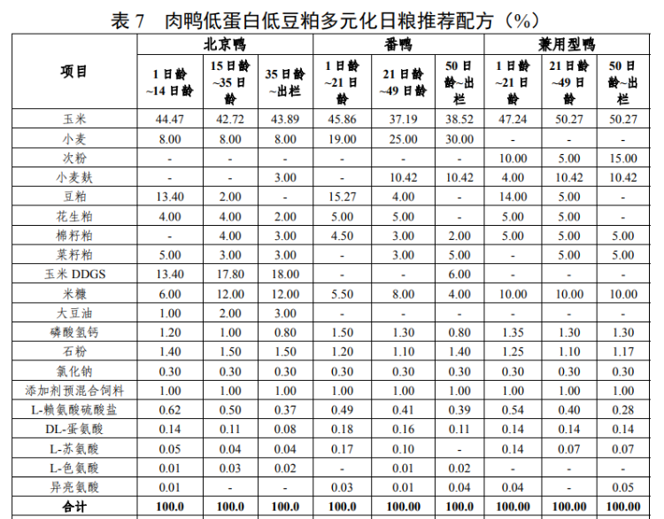 实际应用中,生产者可以在满足肉鸭营养需要的基础上,结合非豆粕型饲料原料的营养特性及使用限量,合理利用杂粮杂粕等非常规饲料原料,同时添加不同种类的合成氨基酸来配制肉鸭低蛋白低豆粕多元化日粮。不同饲养阶段不同类型肉鸭低蛋白低豆粕多元化日粮推荐配方见表7,半番鸭低蛋白低豆粕多元化日粮推荐配方可参照番鸭的推荐量来设计。