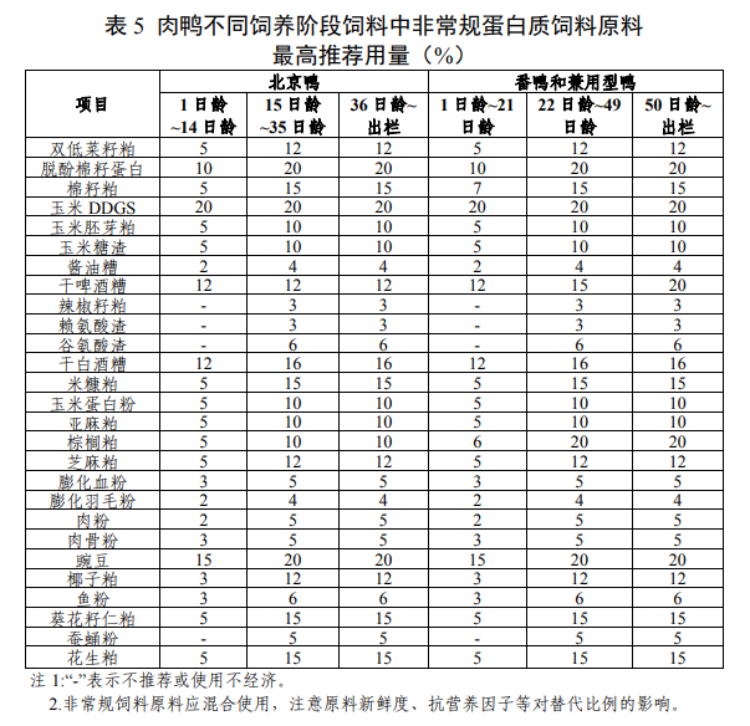 非常规蛋白质饲料原料的用量不应超过该原料的最高推荐用量。此外,多种非常规蛋白质饲料原料的搭配使用不仅可实现各种原料间氨基酸含量及组成差异的互补,也可极大地降低某一特定抗营养因子的水平,减少有毒有害物质对肉鸭生长的危害。北京鸭、番鸭和兼用型鸭等不同类型肉鸭不同饲养阶段日粮中非常规蛋白质饲料原料的最高推荐用量见表5。半番鸭不同饲养阶段日粮中非常规蛋白质饲料原料的最高推荐用量可参照番鸭的推荐量。