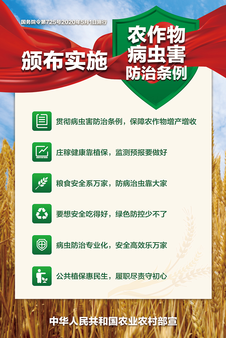 贯彻病虫害防治条例,保障农作物增产增收;庄稼健康靠植保,监测预报要做好;粮食安全系万家,防病治虫靠大家;要想安全吃得好,绿色防控少不了;病虫防治专业化,安全高效乐万家;公共植保惠民生,履职尽责守初心。