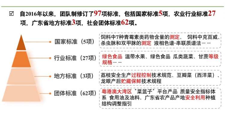 广东省农产品质量安全共性关键技术创新团队主要以农药、兽药、违禁投入品等有害物质为目标,围绕农产品质量安全等源头控制、过程监控、风险预警、标准规范展开研发工作,形成产品和技术创新并集成应用,科研成果累累。