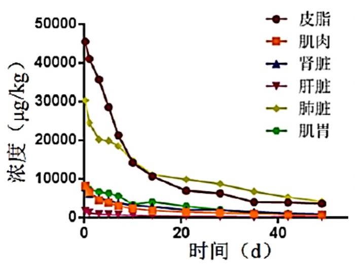恩诺沙星在乌鸡体内的残留消除曲线(乌鸡口服恩诺沙星,停药后,皮脂和肺脏中的恩诺沙星含量相对较高)