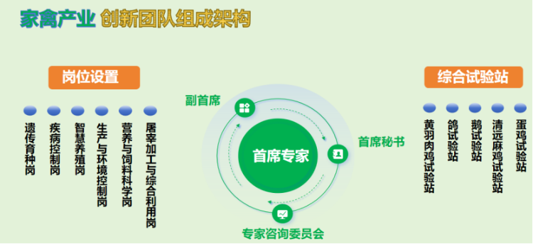 家禽创新团队以广东省家禽资源禀赋和独特的历史文化为基础,围绕限制我省家禽产业可持续健康发展的关键问题:种源创新、疫病净化升级、绿色健康养殖创新、智慧养殖与无害化处理、产品加工与利用,组建1(首席专家)+8(副首席与岗位专家)+5(示范基地)+1(首席秘书)的创新团队。团队岗位汇聚来自华农、省农科院、仲恺等多家单位的行业知名专家,涵盖育种、营养、疫病、环境控制、产品加工、智慧养殖全链条,为广东家禽产业提供了全方位、强有力的科技支撑,是广东家禽产业高质量发展的坚实后盾。