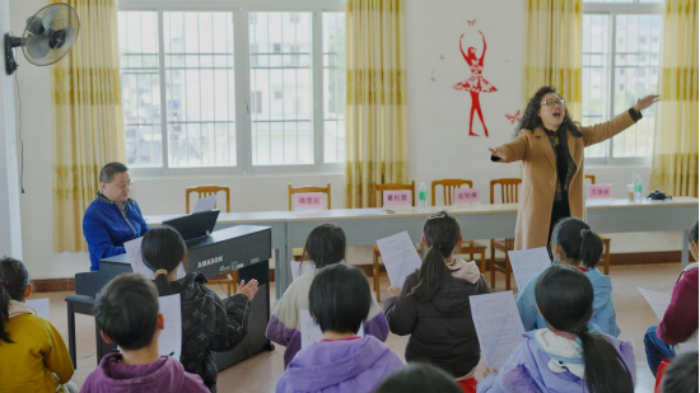 金旭庚主席在致辞中引用 “桐花万里丹山路,雏凤清于老凤声”,点明“雏凤合唱团”之名的诗意来源与美好寓意。他强调音乐是触动灵魂的通用语言,音乐赋能在乡村振兴的文化建设中意义非凡。如孩子们排练的原创合唱作品《梦想在春天里发芽》所传达,音乐赋予乡村孩子追逐梦想的力量,通过音乐打开视野和新的世界。合唱的集体性促使孩子们在协作中学会倾听、尊重与包容,在旋律滋养下陶养情操,在演唱训练中找到自信,不仅丰富乡村文化生活,更能照亮孩子人生的前行之路,塑造其未来。这也是广东省音协策划这个项目的初衷。