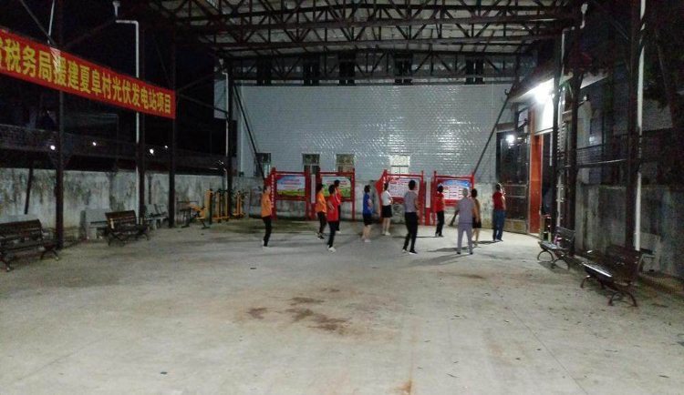 村民在阜安楼文化广场跳广场舞,棚顶为铺设的光伏板。