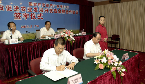 省农业厅谢悦新厅长、国家开发银行广东省分行戴达年行长在协议上签字
