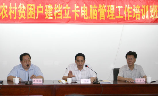 为贯彻落实广东省扶贫开发“规划到户责任到人”工作电视电话会议精神和《中共广东省委办公厅广东省人民政府办公厅关于我省扶贫开发“规划到户责任到人”工作的实施意见》(粤发办〔2009〕20号),切实做好贫困村和贫困户“建档立卡、电脑管理”工作,省扶贫办决定在广州举办农村贫困户建档立卡工作培训班,分三期对全省21个地级市、84个县(市、区)扶贫办的分管领导和业务骨干进行培训。今天(9月3日)上午,第一期培训班在省农业厅开班。省扶贫开发领导小组副组长、省农业厅党组书记、厅长谢悦新同志,省农业厅副厅长、省扶贫办主任林果先分别在培训班上作重要讲话。