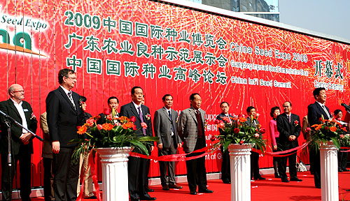 今天(11月25日)上午,由农业部农业贸易促进中心和广东省农业厅联合主办,广东省农作物技术推广总站、广东省种子管理总站和广州种子商会共同承办的2009中国国际种业博览会暨广东农业良种示范展示会在广州盛大开幕。农业部原常务副部长、中国国际贸促会农业分会会长万宝瑞和广东省政府副秘书长颜学亮出席开幕式并讲话,来自全球30多个国家和地区的种子企业、种业组织、采购商,以及全国各省、自治区、直辖市农业系统,广东省直有关部门代表共2000多人参加了开幕式。本届种博会融合了中国国际种业博览会、广东农业良种示范展示会和中国国际种业高峰论坛三大国内种业顶极盛会,开创了世界种业会展新模式,共有来自全球30多个国家和地区的450多家企业和组织参加展示展览,展示品种达4799个,成为推进中国种业新一轮大发展的一个里程碑。