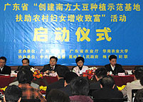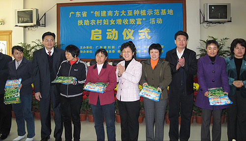 3月11日上午,广东省梅州市蕉岭县长潭镇神岗村彩旗飘飘、人头攒动,由省妇联、省农业厅、华南农业大学共同主办的广东省“创建南方大豆种植示范基地,扶助农村妇女增收致富”活动启动仪式隆重举行。省妇联、省农业厅、华南农业大学、省扶贫办相关领导,韶关、河源、梅州等9个地级市妇联和农业局领导以及梅州市100多人出席了会议。