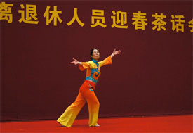 与会者自编文艺节目为茶话会助兴,祝愿老干部们快乐健康长寿。