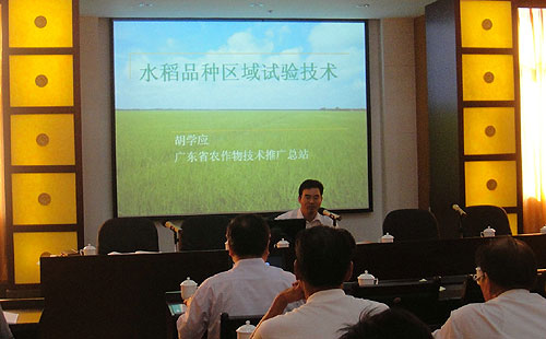 省农作物技术推广总站胡学应副站长对广东省水稻品种区域试验工作进行了简要回顾,充分肯定了全省各试点对我省水稻品种审定与应用所做出的重大贡献,并指出:广东省水稻品种试验规模不断扩大,试验对照品种升级换代,品种试验队伍素质不断提升,试验管理科学公正,但同时仍然存在部分试点基础设施较为落后,新加入区试队伍的人员素质有待提升等问题。他要求各试点技术人员要严格按照试验方案和有关技术要求进行试验,要以公平、公正、负责的态度保证试验过程和试验结果的真实性、科学性和准确性,要及时提交试验结果,积极参加培训学习,不断提高业务水平。他随后还为大家主讲了水稻品种区域试验操作规范。