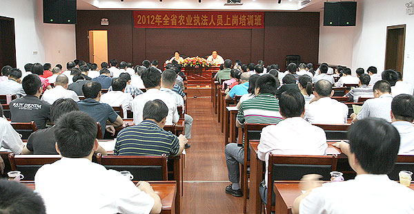 6月19日下午,广东省农业厅举办的2012年全省农业行政执法人员持证上岗培训班在广州正式开班,省农业厅余俭娥巡视员出席会议并讲话。培训班邀请了知名法学专家讲课,系统讲授行政处罚法、行政复议法、行政诉讼法、国家赔偿法、行政强制法及农业行政处罚程序、农业行政执法文书制作等实用知识。全省新转入农业行政执法工作岗位,具备农业行政执法人员资格条件,未取得农业行政执法证的人员共160多学员参加了培训。