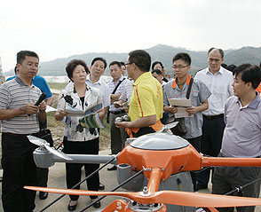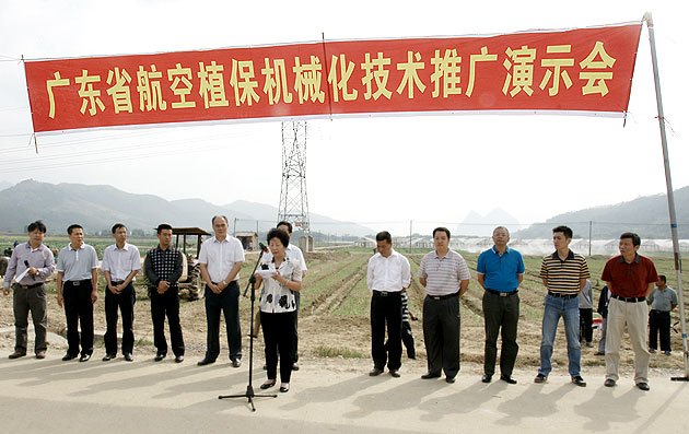 10月22日,由广东省农业厅主办、农业机械化技术推广总站和农业有害生物预警防控中心承办的航空植保机械化技术推广演示会在韶关市曲江区举行。演示会的目的是为了加快推进现代农业装备工程建设,进一步加大新型环保高效型农业机械化技术的推广应用力度。省农业厅潘雪芬副巡视员出席推广演示会并讲话。厅农机化办、全省15个省级农机化示范县农机(农业)局主管农机推广工作领导和农机技术推广站负责人;部分县植保站、统防统治示范作业公司代表;韶关市各县(市、区)农机(农业)局主管农机推广工作领导和农机技术推广站负责人;曲江区农业生产企业、农机(农业)专业合作社、农机(种植)大户、农机手、镇农技(机)站代表和当地农民群众等近300人观看了来自省内外6家企业30余种航空植保机械的现场展演示。