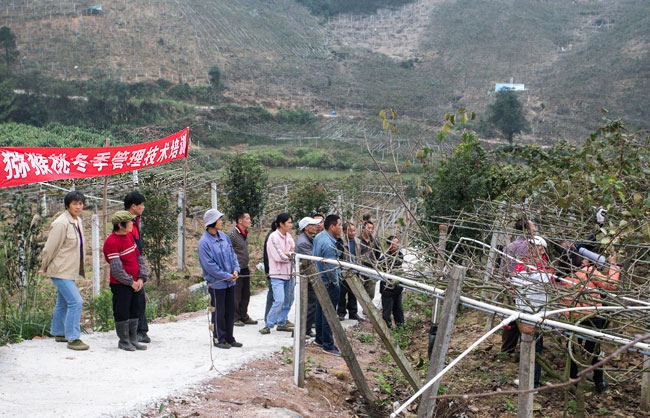 农业专家组织和平县下车镇高峰猕猴桃种植专业合作社的社员现场教授如何剪技